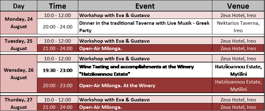 You can expand your tango experience on the island with additional days of learning and dancing. This unique holiday perfectly blends relaxation with passionate dance. Your days will start with engaging Tango lessons every morning, focusing on technique and connection, helping you elevate your skills. After relaxing at the hotel swimming pool or at the sea you get ready to spend the evening dancing tango in hotel, at the local winery after wine tasting or dancing greek traditional dances in a local taverna after sharing a traditional dinner.